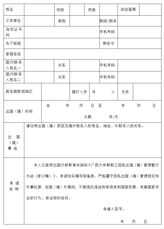 广西大学离退休教职工出国(境)报备表